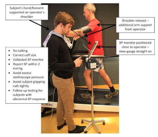 Guidelines recommend that BP measurement should take place before the exercise test, at every stage of exercise (including peak/maximal intensity if such a test is performed), and in recovery from an exercise test [,]. Manual auscultation remains the recommended approach [,] although there are automated, motion-tolerant devices in widespread clinical use that have shown reasonable concordance with manual or invasive exercise BP measures [,]. As with best-practice measurement of BP under resting conditions, operators must follow a standardized protocol to measure exercise BP because deviation from recommended protocols will increase the likelihood of BP measurement error []. Clinical exercise professionals should familiarize themselves with the correct measurement protocol as outlined in Table 1 and Figure 2 [].