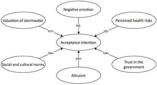 Most urban residents have a positive view of the value of stormwater, arguing that collecting stormwater is a form of “saving” and that the flow of stormwater into sewage is wasteful [5]. However, the impact of the stormwater valuation on their acceptance intention to use recycled stormwater remains unclear. In Wu et al.’s study [6] in Australia, more than 80 percent of respondents considered stormwater to be a valuable resource, and stormwater reuse was critical to addressing water scarcity, but their value judgment about stormwater did not impact their attitude and acceptance intention to use recycled stormwater. Some researchers assumed that the insignificant relation might be due to residents’ perception of water quality or their personal experience, which may lead some users to not intend to use water given a concern of health safety [34]. Therefore, residents’ value judgments about stormwater may or may not impact their intention to accept stormwater reuse.