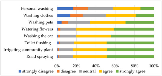 The use of recycled stormwater is usually divided into potable and non-potable uses [11], and non-potable uses are further subdivided into more specific uses by researchers depending on the degree of close contact with body [33]. Studies have shown that residents’ intention to use recycled water is related to the intended uses of the water; that is, the higher the degree of close contact with human body, the lower the willingness people present to use the water [14,29,56]. Considering the low public acceptance for using recycled stormwater for potable purposes, which often involves high treatment cost and safety standards, we followed the existing research [29], and only tested using recycled stormwater for non-potable residential uses, including: