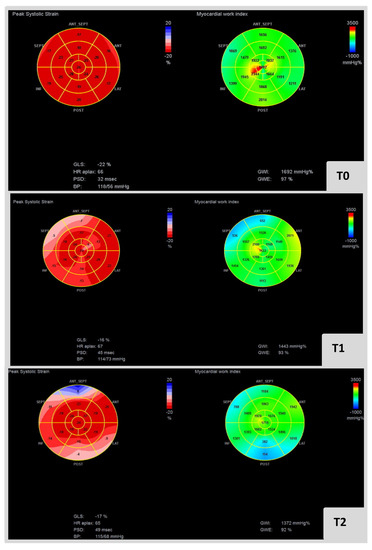 - Breast cancer patients under cancer therapy showed impaired values of global LV myocardial work parameters—GWI, GCW, GWW and GWE—compared to baseline;