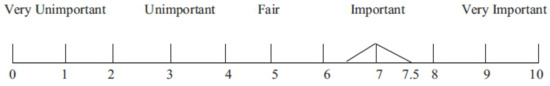From the maritime assessment factors in Table 1, a series of factors that can be used to assess marine accidents are collected. The purpose of the questionnaire is to include these. In the first stage, the relative importance criteria (average 7.5 and above) were selected by asking experts to answer the questionnaire. The respondents answer ranges from 0 to 10, with a high score indicating that it is very important, as shown in Figure 1. In this study, three maritime scholars, six shipowners, and one government official in charge of maritime affairs were asked to fill in the answer. Ten respondents in areas of expertise adjusted and gave comments on the preset perspectives and indicators of this study and, finally, sorted out maritime incident assessment factors. In the second stage, the important scale based on triangular fuzzy number (average value 7.5 and above) was established.