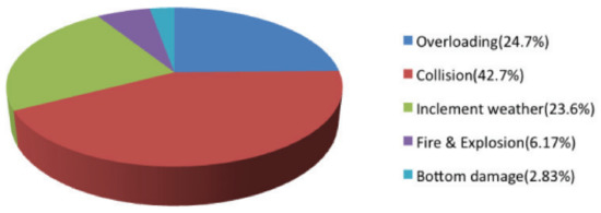 A total of 547 maritime accidents were recorded in Taiwan from 2013 to 2018 [34]. Figure 2 shows the principal causes of maritime accidents. In terms of numbers, collision (42.7%) and overloading (24.7%) accounted for 67.4% of the total accidents, and inclement weather accounted for 23.6% of the total accidents. The remaining marine accidents accounted for less than 9%, which pertained to leaking and extreme misfortune. These statistics reflect that hull/machinery damage, grounding/stranding, and fire/explosion did not change significantly in recent years, but collision/contact and others seemed to increase. Moreover, the location of marine accidents can serve as a basis for marine treatment.