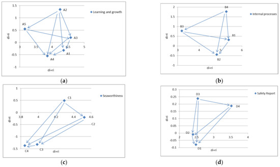 As can be seen from Table 2, a (learning and growth) is the first in the intensity index of giving and receiving influence (5.765 in total sum (dA + rA)); B (internal processes) is second; and C (seaworthiness) is the next. In short, learning and growth (A) is the most important influencing factor. The safety report (D) affects the other factors the least (3.315 in total sum (dD + rD)). Due to improper operation or inadequate training of seafarers, risk assessment should focus on personnel learning and growth. Therefore, the learning and growth (A) perspective has the strongest relationships with the other perspectives. In addition, the values of di − ri for the A, B, and C perspectives are positive, meaning that they affect other factors in the perspectives. If the D values of di − ri are negative, it means that the criteria are influenced by other criteria.