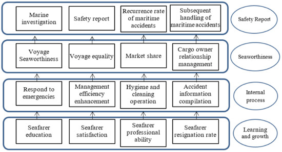 According to the strategic map developed by [37], as shown in Figure 4, this paper illustrated a designed strategy map to enhance risk accident analysis. Like the BSC dimension, internal processes promote the customer satisfaction. Marine seaworthiness is the same as the objective of BSC customer satisfaction. The proficiency of crew operation is to reduce the probability of maritime accidents. Finally, the strategy map aims at the financial results of the enterprise, and the maritime safety report is just like the financial dimension of BSC. This result can be compared with the past literature and effectively apply strategic management to environmental risk assessment [35,36].