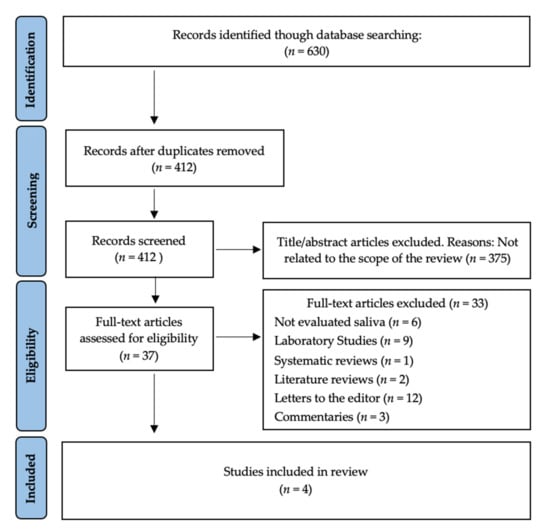 The search strategy resulted in 630 articles. There were 218 duplicates; therefore, 412 remained. Then, two authors (A.G.-S. and A.-O.S.-P.) independently examined the titles and abstracts and excluded 375 articles that were beyond the scope of this study. Therefore, we obtained 37 possible references. After reading the full text of those 37 papers, 33 were excluded because they investigated areas other than oral cavity saliva and/or oropharyngeal saliva (n = 6) or were experimental laboratory studies (n = 9), systematic reviews (n = 1), literature reviews (n = 2), letters to the editor (n = 12), and commentaries (n = 3). Therefore, four studies were included in our systematic review (Figure 1).