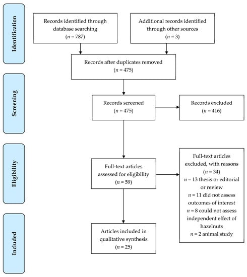 Studies were included if they met the following criteria: were intervention studies in human participants, included hazelnuts, and evaluated at least one of the study outcomes (see Table 1). Studies were excluded if they were non-English language, reviews, expert opinions, theses, animal, or in vitro studies, if the independent effects of hazelnuts could not be assessed, or if hazelnut oil was used as the test food. Our PICOS statement is outlined in Table 1.