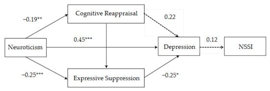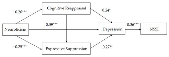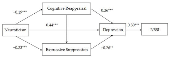 In comparison, the analysis showed that for female students, neuroticism significantly negatively predicted cognitive reappraisal (β = −0.26, p < 0.001) and expressive suppression (β = −0.25, p < 0.001); however, it significantly positively predicted depression (β = 0.39, p < 0.001). Cognitive reappraisal significantly positively predicted depression (β = 0.24, p < 0.05), while expressive suppression significantly negatively predicted depression (β = −0.27, p < 0.01). Moreover, depression significantly positively predicted NSSI behavior (β = 0.36, p < 0.001) (Table 5).