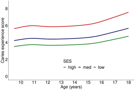 Caries experience score depending on socioeconomic status (SES) across age groups; 905 participants included in the analysis.