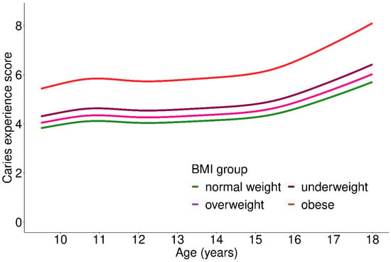 Caries experience score depending on nutritional status (BMI group) across age groups; 1008 participants included in the analysis.