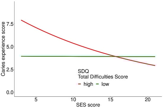 Caries experience score depending on self-reported strengths and difficulties at different SES scores; 905 participants included in the analysis.