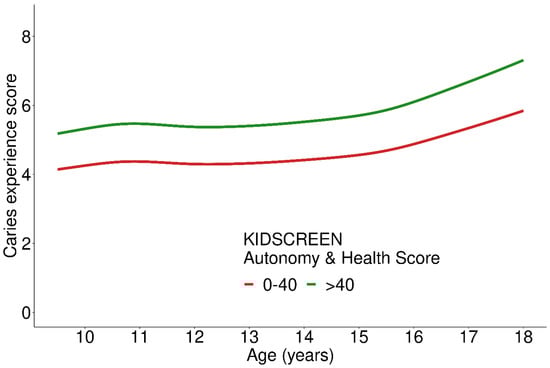 Caries experience score depending on KIDSCREEN Autonomy and Parent Relation score at different ages; 1005 participants included in the analysis.