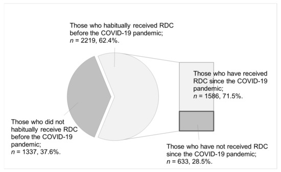 Figure 1 shows the number and proportion of participants receiving RDCs before and since the COVID-19 pandemic. Of the 3556 participants, 62.4% habitually received RDCs before the pandemic, and 37.6% did not habitually receive RDCs. Of the 2219 participants who habitually received RDCs before the COVID-19 pandemic, 28.5% had not received RDCs since the pandemic.