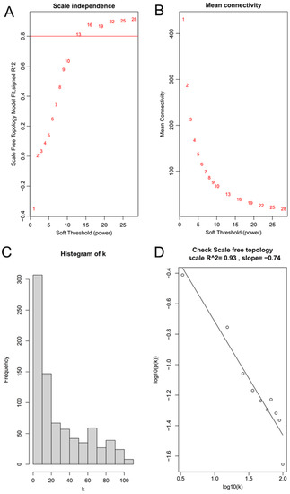 Determination of the best soft-threshold power in the WGCNA. (A) Analysis of the scale-free fit index for various soft-threshold powers (from 1 to 28); (B) analysis of the mean connectivity for various soft-threshold powers (from 1 to 28); (C) the histogram of k; (D), the correlation coefficient between k and p (k) to check the scale-free topology when β = 13.