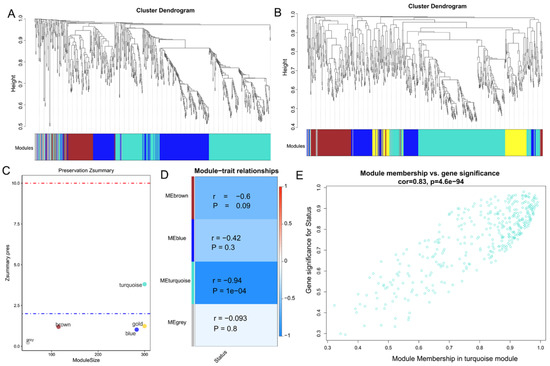 Identification of modules associated with CNT-induced malignant transformation of lung cells. (A) A clustering dendrogram obtained from data of the GSE41178 dataset; (B) a clustering dendrogram obtained from data of the GSE56104 dataset; (C) the preservation median rank of co-expression modules; (D): module–trait associations. Each row corresponds to a module eigengene (ME) and each column to a trait. Each cell contains the corresponding correlation (r) and p-value; (E) scatter plot showing the correlation of gene significance versus module membership for genes in the turquoise module.