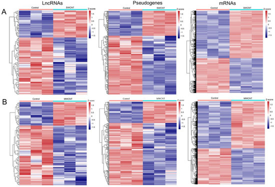 Heatmap of the expression levels of all differentially expressed lncRNAs, pseudogenes and mRNAs between CNT-exposed and control SAECs. (A) The difference between SWCNT-exposed and control SAECs; (B) the difference between MWCNT-exposed and control SAECs. SWCNT, single-walled carbon nanotube; MWCNT, multiple-walled carbon nanotube; red, high expression; blue, low expression.