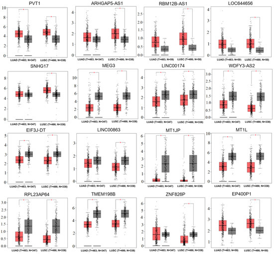 To evaluate whether these hub DE-lncRNAs and DE-pseudogenes were associated with initiation of lung cancer, we validated their expression levels using Gene Expression Profiling Interactive Analysis (GEPIA, http://gepia.cancer-pku.cn; accessed on 12 September 2021), a newly developed interactive web server for analyzing the RNA sequencing expression data of 9736 tumors and 8587 normal samples from the Cancer Genome Atlas (TCGA) and the Genotype-Tissue Expression (GTEx) project [25]. Lung adenocarcinoma (LUAD) and squamous cell carcinoma (LUSC) samples were selected as the disease group; whereas match TCGA normal and GTEx data or match TCGA normal data were selected as the control group. |log2FC| > 0.5 and p-value < 0.05 were set as the cut-off point.