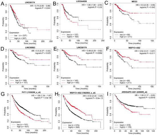 To evaluate whether these hub DE-lncRNAs and DE-pseudogenes were associated with prognostic outcomes of lung cancer patients, the Kaplan–Meier plotting (http://www.kmplot.com/analysis/index.php?p=background; accessed on 12 September 2021) [26] was performed. Kaplan–Meier plots allow for assessment of the effects of DE-lncRNAs and DE-pseudogenes (included in mRNA data) on survival using the GeneChip and RNA-seq data of GEO, the European Genome-Phenome Archive and TCGA databases. The overall survival (OS) and recurrence-free survival (RFS) was assessed by RNA-seq data analysis, whereas OS, first-progression survival (FPS) and post-progression survival (PPS) were assessed in GeneChip data analysis. Patients were divided into two groups by “auto-select best cut-off”. Hazard ratios (HRs) with 95% confidence intervals (CIs) and log-rank p-values were automatically calculated. A log-rank test p-value < 0.05 was considered statistically significant. HR < 1 indicated a better survival rate for the high-expression group; HR > 1 indicated a poor survival rate for the high-expression group.