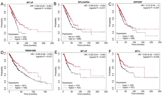 - Ding, Y.; Liu, N.; Chen, M.; Xu, Y.; Fang, S.; Xiang, W.; Hua, X.; Chen, G.; Zhong, Y.; Yu, H. Overexpressed pseudogene MT1L associated with tumor immune infiltrates and indicates a worse prognosis in BLCA. World J. Surg. Oncol. 2021, 19, 133. [Google Scholar] [CrossRef] [PubMed]