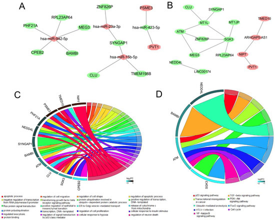 To understand potential functions of mRNAs regulated by DE-lncRNAs and DE-pseudogenes, the online Database for Annotation, Visualization and Integrated Discovery (DAVID) (v6.8; http://david.abcc.ncifcrf.gov; accessed on 12 October 2021) [31] was searched, after which gene ontology (GO) biological process, molecular function terms and Kyoto Encyclopedia of Genes and Genomes (KEGG) pathways were obtained at a significance level of p-value < 0.05. The “Goplot” package in R was used to draw the chord plot for hub DE-mRNAs.