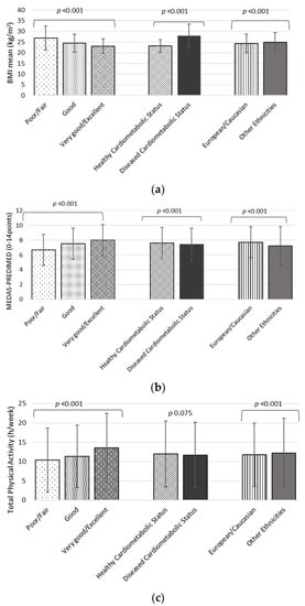 Descriptive Health Characteristics and Lifestyle Categorized by HRQoL, Cardiometabolic Health Status and Ethnicity of the participants of the study. (a) BMI mean Categorized by HRQoL, Cardiometabolic Health Status and Ethnicity; (b) Mediterranean Adherence Score (MEDAS)–PREDIMED Categorized by HRQoL, Cardiometabolic Health Status and Ethnicity; (c) Total Physical Activity Categorized by HRQoL, Cardiometabolic Health Status and Ethnicity.