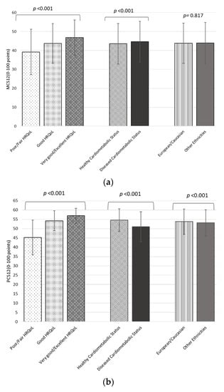 As a measure of global health, MCS12 and PCS12 were assessed (Figure 2). MCS12 showed significative differences between the three categories HRQoL (poor/fair, good and very good/excellent) (39.2 ± 12.0 (95% CI, 38.7–39.7) points, 43.7 ± 10.5 (95% CI, 43.5–44.0) points and 46.8 ± 9.3 (95% CI, 46.5–47.1) points, respectively, with p < 0.001). Furthermore, there was a remarkable difference in MCS12 between either healthy or diseased cardiometabolic status (43.5 ± 10.7 (95% CI, 43.3–43.7) points and 44.7 ± 10.7 (95% CI 44.3–45.0) points, respectively, p < 0.001). However, there were no statistical differences in HRQoL according to ethnicity (p = 0.817). Noteworthily, PCS12 showed differences among all stratifications in the applied statistical tests.