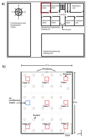 Plan view: (a) Building “X”. (b) Classroom “X002”. The red boxes indicate the different positions of the air extractor considered in this study.