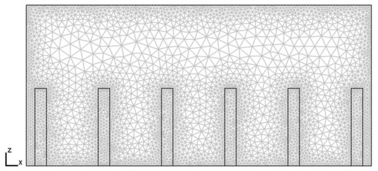 The appropriate mesh size is obtained by a mesh sensitivity study in which the behavior of the average temperature inside the classroom is analyzed for six different mesh sizes with the following node numbers: 255825, 350340, 462348, 550220, 650450, 751825, and 849246. Table 2 shows the behavior of average air temperature convergence for different cases. The maximum difference in the average air temperatures between the two finer meshes is 0.28 °C for case III, 6:30 p.m., Cs = 37,500 ppm, and Re = 15,000. The simulations were carried out by applying mesh refinement towards the walls in order to have greater precision in these regions (see Figure 3). The steady-state simulations were obtained when the consecutive values of each variable were less than 10−6. The spatial discretization was of the order of 0.01 m.