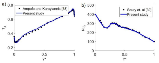 Validation of numerical results: (a) Comparison between mean temperatures for turbulent convection in an air-filled square cavity problem as reported by Ampofo and Karayiannis [38]. (b) Comparison of local Nusselt numbers along the hot wall for the turbulent convection problem in a differentially heated cavity as reported by Saury et al. [39].