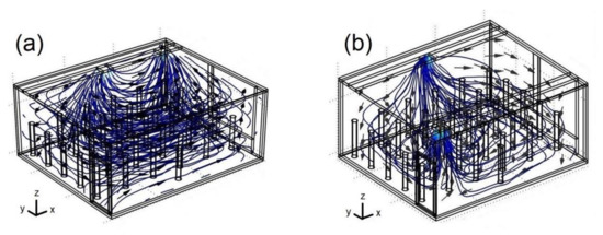 Figure 5 presents velocity fields for two different extractor positions at 3:30 p.m. for Re = 15,000 and Cs = 37,500 ppm. Figure 5a shows the airflow patterns when the extractor is located in the corner formed by the wall with windows and the wall near the air-conditioning supply. In this case, the air-conditioning supply and the exhaust through the extractor are located on the same side. The flow patterns for this configuration show better air distribution inside the classroom, as the airflow circulates from the center of the south wall moving toward the east wall, then proceeds to the north wall, where it changes direction toward the west wall; and when it collides with this last wall, the airflow changes direction again toward the south wall, where it finally rises toward the extractor. Therefore, the air sweep for this case was the most effective since it covers all classroom areas. Figure 5b describes the behavior of the airflow inside the classroom when the extractor is located in the corner formed by the wall that contains the door and the wall opposite to the air-conditioning supply. In this case, the flow dynamics show that the air-conditioning stream is divided into two flows: one of them directed toward the west (hot) wall, which is the most intense, and the other, less intense stream moves toward the east (cold) wall. Subsequently, both streams move toward the north wall; the stream traveling along the east wall has a short trajectory since, when it collides with the north wall, it changes direction, moving toward the extractor in the ceiling. On the other hand, the stream that travels along the west wall has a long trajectory since, when it collides with the north wall, it travels along this entire wall until it reaches the east wall, where it rises toward the extractor. In this case, the air-conditioning supply and the exhaust of the extractor are located on opposite sides. As a result, the air sweep over the hot wall is more intense and has a longer trajectory, transporting a large amount of energy from the window into the classroom.