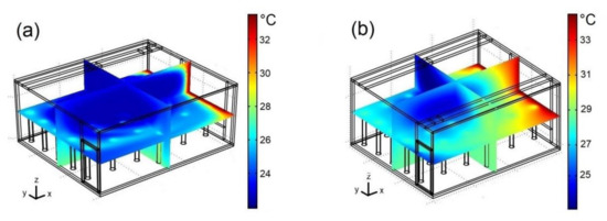 To analyze the thermal behavior inside the classroom, Figure 6 describes the temperature fields for two different positions of the extractor at 3:30 p.m., Re = 15,000, and Cs = 37,500 ppm. Figure 6a presents the distribution of the air temperature inside the classroom when the extractor is located in the corner formed by the wall with windows and the wall near the air-conditioning system. A low temperature can be observed in the center of the classroom due to the cold air stream supplied by the air conditioning. The temperature tends to increase toward the side walls, where the windows and the door are located. However, this increase is greater on the west wall due to the heat flux transmitted by the windows, which are struck by the sun’s rays. The best distribution of cold air flow occurs when the extractor is on the same side as the air-conditioning system. On the other hand, the most adverse temperature field occurs when the extractor is located in the corner formed by the wall that contains the door and the wall opposite to the air-conditioning system (Figure 6b); in this case, significant temperature increases are observed even near the eastern wall. In addition, this configuration results in the largest reduction in the size of the cold region in the center of the classroom. In this configuration the extractor is placed on the side of the cold wall and away from the supply of the air-conditioning system.