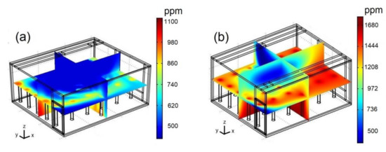 For a general idea of the spatial distribution of the pollutant inside the classroom, Figure 7 shows CO2 concentration fields for two different positions of the extractor at 3:30 p.m., Re = 15,000, and Cs = 37,500 ppm. The case where most of the classroom’s interior has low CO2 concentrations occurs when the extractor is located in the corner formed by the wall that contains the windows and the wall closest to the supply of the air-conditioning system (see Figure 7a). The worst configuration, with extensive high-CO2 regions, is when the extractor is located in the corner formed by the wall that contains the door and the wall opposite the air-conditioning system as shown in Figure 7b. In this case, significant increases in CO2 concentration are observed throughout the XY plane, while the only low-CO2 concentration region is the top center of the classroom.
