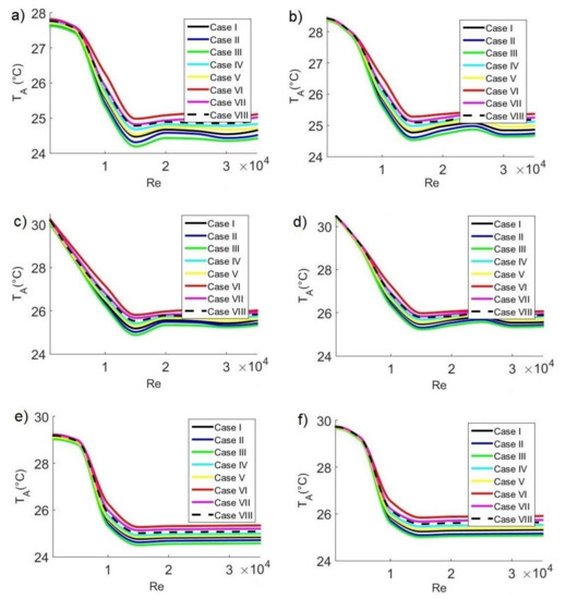 Average air temperature in the classroom as a function of Reynolds number at 11:30 a.m. with CO2 sources of (a) 35,000 ppm and (b) 42,500 ppm; at 3:30 p.m. with CO2 sources of (c) 35,000 ppm and (d) 42,500 ppm; and at 6:30 p.m. with CO2 sources of (e) 35,000 ppm and (f) 42,500 ppm.