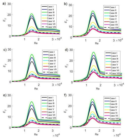 At 3:30 p.m., the maximum values are ET = 25.28 (Figure 9c) and 27.68 (Figure 9d) for Cs = 35,000 and 42,500 ppm, respectively. Figure 9e,f shows the cases at 6:30 p.m. for Cs = 35,000 ppm and Cs = 42,500 ppm, respectively. The maximum values of ET are 23.90 and 26.27 for Cs = 35,000 and 42,500 ppm, respectively. For the three times of the day considered, the maximum values occur for configuration III and Re = 15,000, which coincides with the condition where minimum TA values are obtained.