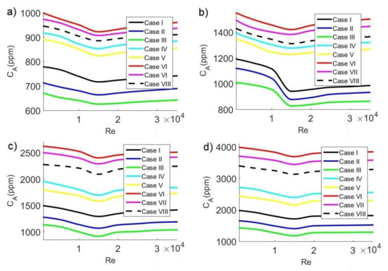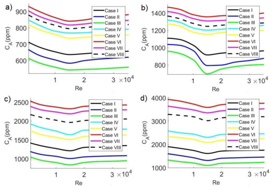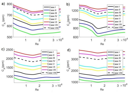 The behavior of the average concentration at 6:30 p.m. are shown in Figure 12. Figure 12a,b shows the cases for Cs = 35,000 ppm and Cs = 37,500 ppm, respectively. For Cs = 35,000 ppm, the minimum value is CA = 541.17 ppm, while for Cs = 37,500 ppm, the minimum value is CA = 697.07 ppm (case III and Re = 15,000). The maximum allowable CO2 concentration (CA < 700 ppm) is met for these two conditions, representing a low risk of contagion by SARS-CoV-2. The maximum values are CA = 931.09 ppm for Cs = 35,000 ppm and CA = 1467.41 ppm for Cs = 37,500 ppm (case VI and Re = 1000). On the other hand, Figure 12c,d shows the cases for Cs = 40,000 ppm and Cs = 42,500 ppm, respectively. For Cs = 40,000 ppm, the minimum value is CA = 836.91 ppm, while for Cs = 42,500 ppm, the minimum value is CA = 1098.12 ppm (configuration III and Re = 15,000). The maximum allowable pollutant concentration value is unmet in these two conditions since CA > 700 ppm. The maximum values are CA = 2520.95 ppm for Cs = 40,000 ppm and CA = 3927.15 ppm for Cs = 42,500 ppm (case VI and Re = 1000).