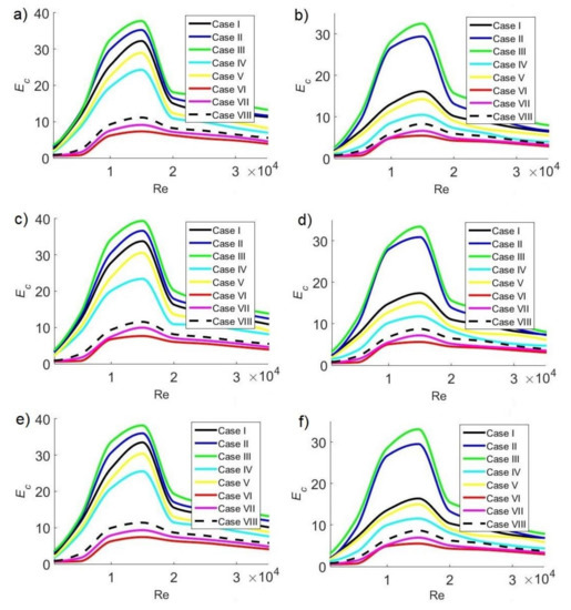 The most favorable cases, where the temperature is within the range of thermal comfort, and the air temperature distribution is more homogeneous, occur for case III, which corresponds to the configuration where the air extractor is located on the same side as the air conditioning system’s air inlet and near the hot window. On the other hand, the configurations with the highest temperatures and the most unfavorable temperature distribution with low ET values occur for case VI, when the extractor is located in the corner furthest from the air inlet of the air-conditioning system and close to the cold inner wall. Furthermore, the path of the air stream since supplied by the air-conditioning system to its exit through the extractor has a substantial effect on air temperature distribution: in all cases, the lowest average air temperature values and the maximum ET values were observed for Re = 15,000. The highest values of average air temperature and the minimum ET values were observed for Re = 1000. At low velocities, air temperature distribution is heterogeneous; however, as the velocity increases, the distribution becomes more homogeneous, reaching an optimal value when Re = 15,000.