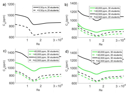 When CO2 sources are of 40,000 and 42,500 ppm, average pollutant concentration remains above the safe limit since CA > 700 ppm; because of this, reducing the number of students is also proposed for these cases. At 11:30 a.m. (see Figure 14b) and 6:30 p.m. (see Figure 14d), with a pollutant source of 40,000 ppm, the maximum allowed value (CA < 700 ppm) is attained by reducing the number of students to 25; for a pollutant source of 42,500 ppm, the number of students must be reduced to 20. At 3:30 p.m. (see Figure 14c), with pollutant sources of 40,000 and 42,500 ppm, it is also necessary to reduce the number of students to 20 to achieve average concentrations below 700 ppm. The minimum average concentration values occur when Re = 15,000 for case III, when the air inlet and outlet inside the classroom are located on the same side.