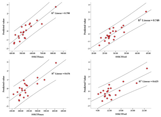 Linear regression analysis determined significant prediction models (Figure 1) for SSKTFmax (ajd.R2 = 0.649, Std. Error of the Est. = 56.56, F = 5.631, p = 0.004), SSKTFrel (ajd.R2 = 0.581, Std. Error of the Est. = 2.97, F = 4.460, p = 0.010), SSKTPmax (ajd.R2 = 0.502, Std. Error of the Est. = 41.16, F = 3.874, p = 0.017) and SSKTPrel (ajd.R2 = 0.424, Std. Error of the Est. = 2.294, F = 3.100, p = 0.037). The magnitude of association was large in all four prediction models.