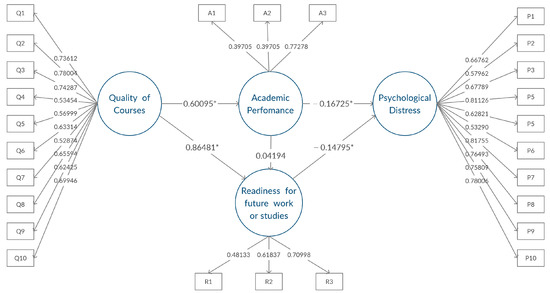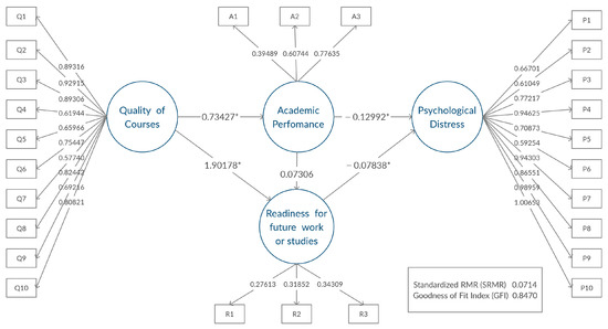 | Readiness for Future Work/Studies =>Psychological Distress | −0.0701 | 0.0319 | 0.0281 | −0.1480 | |
