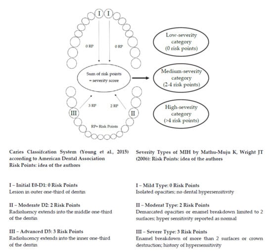 Schematic presentation for detection of the severity score of the patients’ caries-affected or MIH-affected teeth to divide them into severity categories (Michaelis et al.).