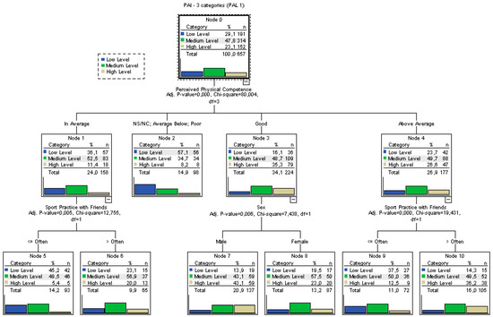 The findings of this study contribute to the increase in knowledge on the factors that affect PAL in primary school students. Particularly, the analysis through classification trees has allowed for the extraction of classification rules and prediction variables of practice levels (active vs. less active/sedentary participants). SPF was the most important prediction variable, although PPC was found to be very relevant as well. This knowledge could be of interest to help increase adherence to practice and preventing sport dropouts, helping students to stay active and acquire healthy habits for the future.