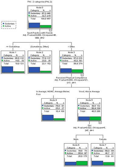 Both classification trees evidenced the power of SPF to predict PA. In agreement with the present research’s findings, other studies have shown the tendency of this variable to predict physical activity practice. Kirby et al. [23] conducted a longitudinal study and observed this influence to be significantly associated with being active in primary school students. The relevance of this aspect has also been confirmed in an important review that analysed different influencing elements related to friends [20]. More specifically, they concluded that, in 9 out of 10 studies, participation with friends and the presence of friends during PA was associated with the participants’ PA. It must be noted that one inclusion criterion of this study was the existence of a PA-predicting variable.