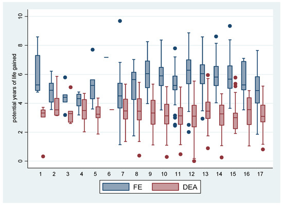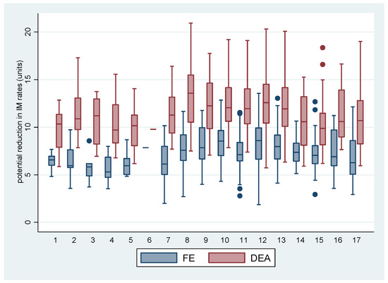 Figure 2 then shows the potential reductions in the IM rates for the RRAS. Unlike LEB, the distributions showed higher values in the DEA model than in the FE model.