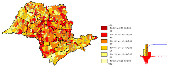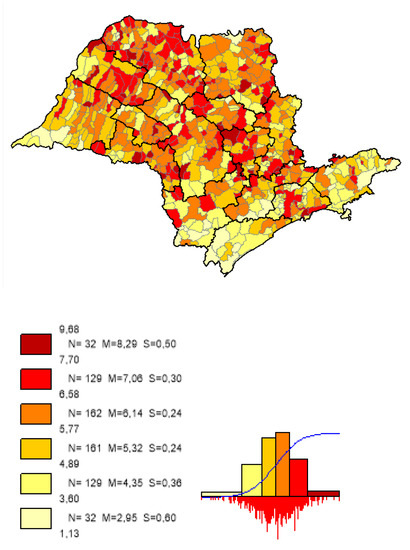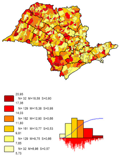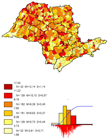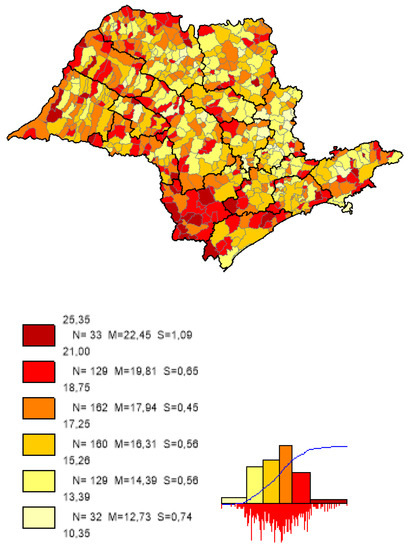 Distribution map of IM rates average results in the municipalities of the state of SP. Note: Choropleth maps, consisting of six divisions, using the following limits—minimum value; 5th percentile; 25th, 50th and 75th percentiles; 95th percentile and maximum value. For each interval, the number (N) of municipalities, their mean (M) and standard deviation (S) are described. The histograms contain bars proportional to the number of localities in each division (Philcarto images).