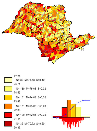 Distribution map of Life Expectancy, average results in the municipalities of the state of SP. Note: Choropleth maps, consisting of six divisions, using the following limits—minimum value; 5th percentile; 25th, 50th and 75th percentiles; 95th percentile and maximum value. For each interval, the number (N) of municipalities, their mean (M) and standard deviation (S) are described. The histograms contain bars proportional to the number of localities in each division (Philcarto images).