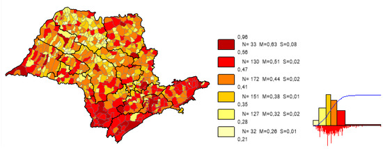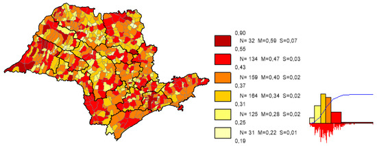 Distribution map of the potential reduction in the IM rates in the municipalities of the state of SP, DEA method. Note: Choropleth maps, consisting of six divisions, using the following limits—minimum value; 5th percentile; 25th, 50th and 75th percentiles; 95th percentile and maximum value. For each interval, the number (N) of municipalities, their mean (M) and standard deviation (S) are described. The histograms contain bars proportional to the number of localities in each division (Philcarto images).