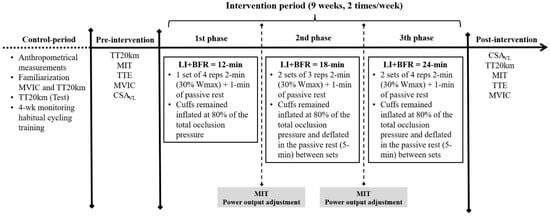 During the first visit, the subject was subjected to anthropometrical measurements and familiarization sessions with maximal voluntary isometric contraction (MVIC) and the TT20 km tests. Thereafter, in the second visit, he performed a TT20 km as a “control test” before initiating a “control period” lasting for the next four weeks. This period was adopted to monitor the cyclist’s performance and his habitual cycling training. After the control period, pre-intervention tests were performed in the following order: visit 3—TT20 km test; visit 4—maximal incremental test (MIT) to determine the VO2peak, first and second ventilatory thresholds (VT1 and VT2, respectively), and Wmax; visit 5—time to exhaustion test (TTE); visit 6—MVIC test and visit 7—measurements of the CSAVL of both legs. The post-intervention tests followed the same order, with the exception of the CSAVL measurements, which were conducted 72 h after the last training session. Figure 1 shows the experimental overview. The subject was instructed to refrain from intense exercise on the day before the tests. An interval of 48–72 h between all testing sessions (visits from 1 to 7) was given in pre- and post-intervention. The subject was also oriented to refrain from caffeinated foods and beverages (i.e., coffee, chocolate, etc.) for 24 h before the tests. All tests were conducted at the same time of day in similar environmental conditions with controlled temperature (21 °C) and monitored humidity (71.4 ± 3.3%).
