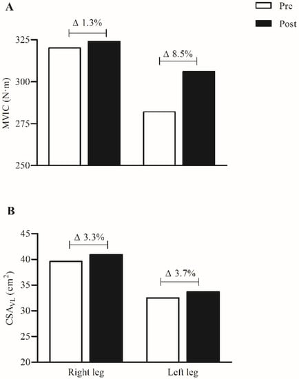 (A) maximal voluntary isometric contraction (MVIC) pre (white bars) versus post-intervention (black bars) of the right and left legs; (B) vastus lateralis cross-sectional area pre- (white bars) versus post-intervention (black bars) of the right and left legs.