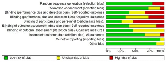 The risk of bias for each study was assessed for all domains, as described in the Cochrane Handbook []. No article was excluded, all studies reached a quality level and low risk of bias according to assessment tools (see Figure 2).