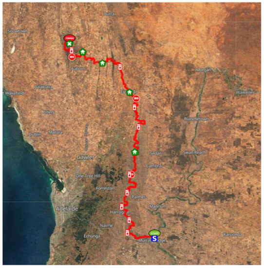 The Irrational S.O.U.T.H ultra-marathon is a 200-mile (326 km) event traversing the Lavender Trail from Murray Bridge to Clare in South Australia. The race measures 202 miles (326 km) but is categorised and known as a 200-mile event. Beginning at 07:00 h on 9 June 2021, runners had a time cap of 100 h to complete the event [9]. Temperatures in the Murray Bridge area ranged between 3.5 °C and 19 °C, with temperatures in Clare ranging from 1.7 °C to 15.9 °C for the duration of the event [10]. The event course was inclusive of 13 aid stations providing hydration, nutrition, and support to the competitors (Figure 2). Four of the aid stations were equipped as sleep stations, with a bed and/or stretchers available to competitors [9].