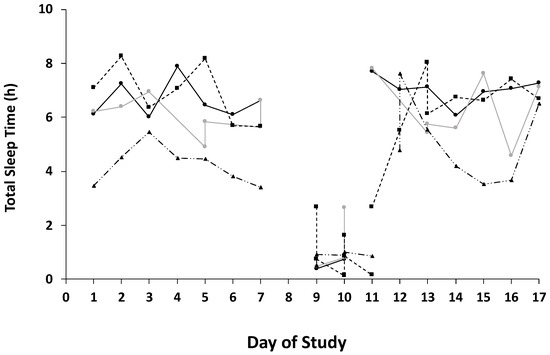 Individual data points for sleep variable total sleep time (h) across the 17-day observational study. Individual participants are designated by different line types.